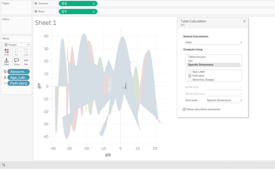 Go to @X and Edit table calculation.Under Nested calculation select @X then under ‘Specific dimensions’ select Path(bin).